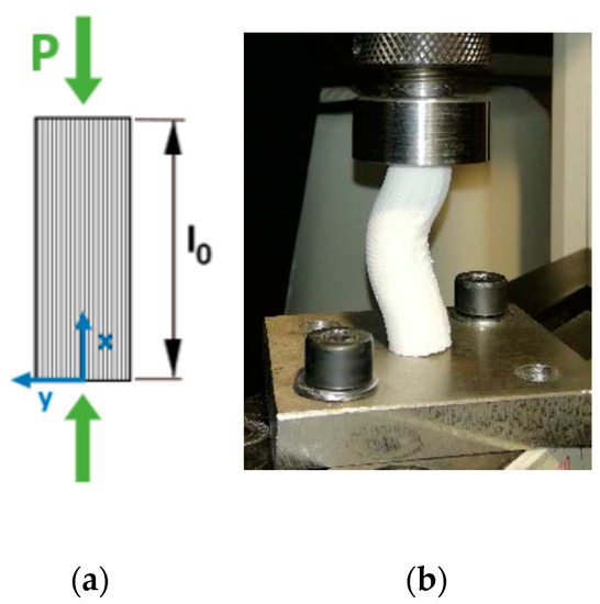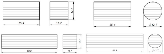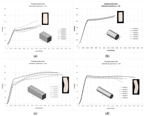 In the case of the compression test, the ASTM D695 standard [30] specifies that the test specimen shall be in the form of a right cylinder or prism (square), whose length is twice its width or diameter. However, when the modulus of elasticity and offset yield-stress are desired, the test specimen shall be of such dimensions that the slenderness ratio (λ) is in the range from 11 to 16:1. In this case, the preferred specimen sizes were 12.7 (a) by 12.7 (a) by 50.8 mm (L) (prism), or 12.7 in diameter (D) by 50.8 mm (L) (cylinder) (Figure 7). In literature consulted concerning this test, the length of the specimens was usually twice its principal width or diameter. Exceptionally [32,33,34,35] long-length specimens were tested.