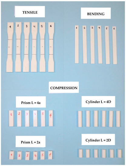 As regards the shape and dimensions of the specimens tested, the recommendations of the standards were followed. For the tensile and bending tests, the options were quite clear; however, in the case of the compression test, two cross-section shapes were possible, and the specimen length depended on the mechanical property to be obtained.