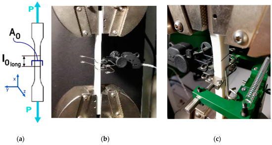 Tensile test assembly. Tensile test diagram (a); the longitudinal (b) and transverse (c) extensometers fitted on the specimen are shown.
