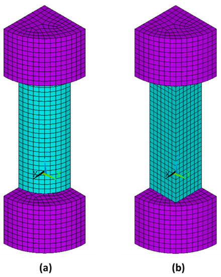 Figure 11. Finite element model for the cylindrical (a) and prismatic (b) short specimens. The purple elements correspond to the steel plates of the testing equipment.