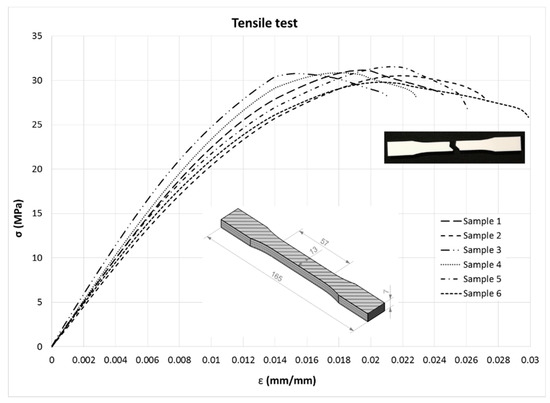 Figure 12 shows the stress–strain curves, overlapped for all specimens. Figure 13 illustrates the tensile failure of a sample after the test.
