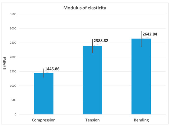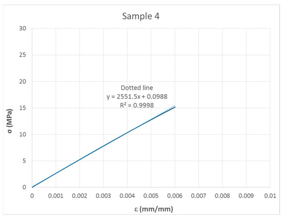 From the data recorded during the test, the values of stress (σ), strain (ε) and modulus of elasticity (E) were calculated (Equation (1)).