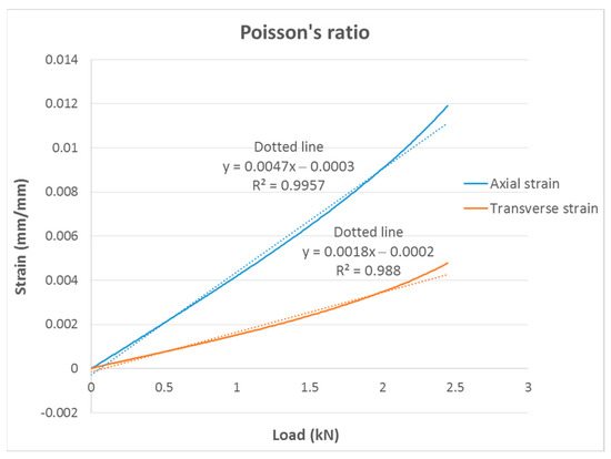 The Poisson’s ratio (ν) was calculated from the data recorded by the two extensometers (linear and transverse). Figure 15 shows both deformations as a function of the applied load. With the slopes of these two straight lines, ν was calculated by dividing the values by each other.