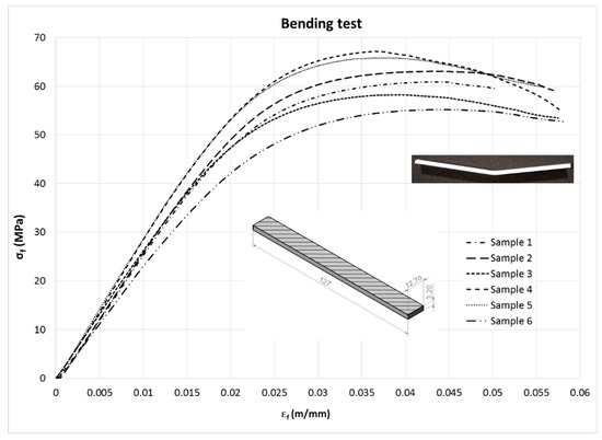 In a similar way to the tensile test, the values of stress (σ), strain (ε) and modulus of elasticity (E) were calculated (Equation (1)).