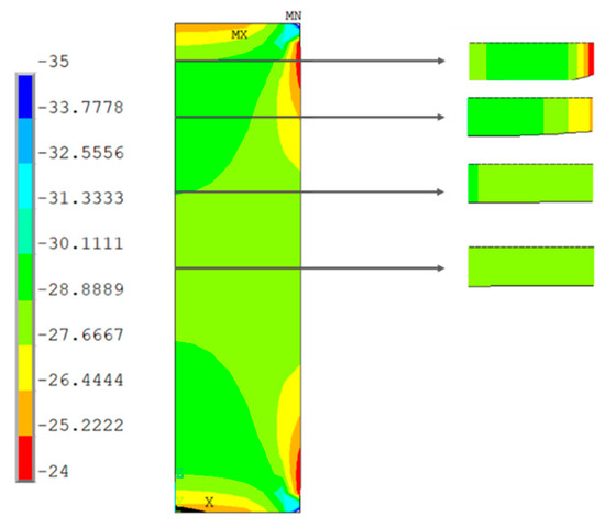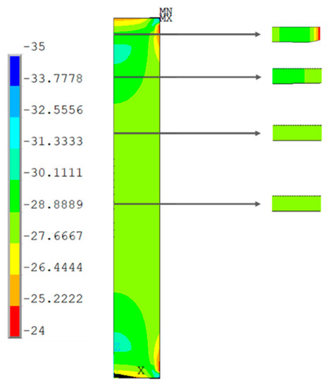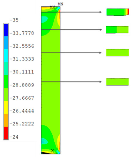 The analysis reproduced the conditions of the compression test. The steel plates of the test setup were also simulated, and a contact between the specimen and the steel was introduced with a coefficient of friction of approximately 0.4 [39]. To define the boundary conditions, the bottom line of the bottom steel plate was fixed with zero displacement in all directions, and a negative vertical displacement was defined in the top steel plate. Symmetry boundary conditions were introduced at the two planes of symmetry.