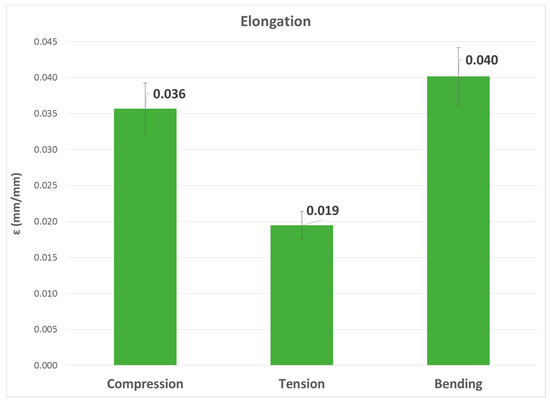 Finally, the graphs of the elongation values were compared. As above, the highest value corresponded to the bending test, followed by compression, although they did not show such a significant difference. The elongation for the tensile test was the lowest.