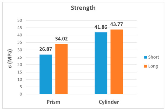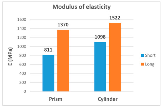 As can be seen in Figure 26, the modulus of elasticity of long specimens was considerably higher regardless of the cross-section shape. This result is consistent with [34]: Young’s modulus decreases when the diameter:length ratio increases. In the case of cylindrical specimens, the value for long specimens was 40% higher, being 70% higher in prismatic specimens. On the other hand, the cylinder shape also had a higher value within each length. Thus, the highest value was that of long-cylinder specimens.