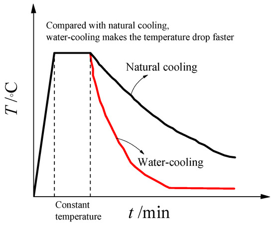 The change diagram of the ambient temperature of the specimen under high temperature treatment and different cooling method is shown in the Figure 2. It can be seen from the figure that water-cooling makes the temperature drop faster. The specimens can be subjected to high temperature treatment and be exposed to fire on its four surfaces sides in a RX3-45-9 electric oven. With its own heating temperature control system and temperature sensor, specimens rose to the target temperature at a steady rate in the furnace, and then kept the temperature in the furnace unchanged within the design time. After that, some parts of specimens were cooled by water and the remaining specimens were naturally cooled in the furnace.