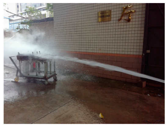 The specimens, to be water-cooling, were transported from the high temperature furnace to the handcart flush with the high temperature furnace mouth, and then moved quickly to the outdoor for simulating fire sprinkler treatment. A single fire hydrant was used to cool the specimen within 5 m. The water consumption of the spray gun was recorded and controlled by the water meter, and the specimen was sprayed with water for 25 min. According to the two Chinese codes, namely GB50016-2014 [21] and GB50974-2014 [22], respectively, the diameter of hydrant port used in the test is 65 mm, and the diameter of monitor nozzle is about 19–20 mm. Before water-cooling, the water output of a single spray gun can be kept at about 15 L/s by using a water meter and a stopwatch, and then the water spray treatment can be carried out. The field operation of the test is shown in Figure 3. After water-cooling, the specimen was put into a static position, and its mass subjected to water-cooling for the first, second, and third days and before loading were recorded respectively, so as to obtain its mass loss rate.