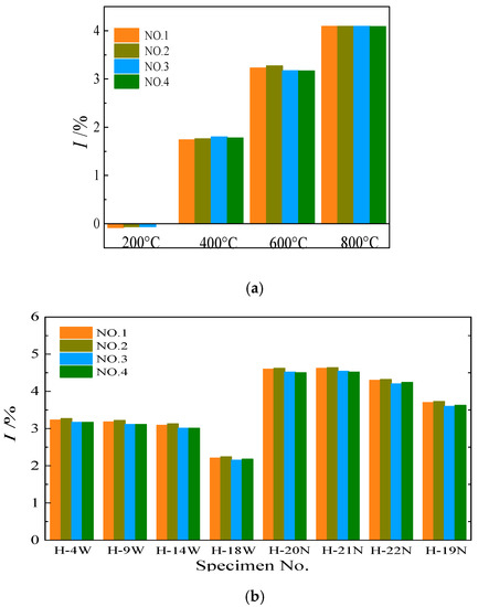 Since the mass loss rate of specimens is mainly related to temperature, various strength grade changes similarly with the temperature, so that with design strength of 60 MPa is taken for comparative analysis. Their variation laws with design parameters are shown in Figure 6, wherein NO.1–NO.4 respectively represent the results obtained after weighing the specimen for the first to fourth time. It can be seen from Figure 6a, when maximum temperatures were less than 400 °C, the mass loss rate of the specimen was smaller, and when maximum temperatures were more than 400 °C, that significantly increased with the rise of temperature. At the same time, when maximum temperatures were less than 600 °C, the mass of each specimen fluctuated within the first three days after the water-cooling. However, when the standing time was longer than three days, the mass of the specimens did not change significantly, indicating that the water content in the specimen was basically stable. For specimens exposed to a temperature of 800 °C, the mass loss rate of specimens was relatively stable, which indicated that the water in the specimen had fully evaporated by the residual heat of the specimen itself after water-cooling. Figure 6b illustrates the variation rule of mass loss rate of each specimen under different cooling methods (the H at the beginning of the specimen No. in the figure represents HSCFST). As can be seen from the figure, the mass loss rate of all the water-cooled specimens was significantly lower than that of the corresponding naturally cooled specimens. According to research by Ke et al. [23], this may be because during the process of water-cooling, water entered the interior and rehydrated with the concrete subjected to high temperatures, forming hydration products that remained some of the water infiltrated into the concrete.