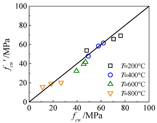 where fcu(T) is the cube compressive strength of high strength concrete block after exposure to ETWC, fcu,20 is the cube compressive strength of high strength concrete block under normal conditions and T is the maximum temperature of water-cooling blocks. This formula is applicable to the strength estimation of concrete with the strength of 60–80 MPa, subjected to the highest temperature within 800 °C and water-cooling. Figure 7 shows the comparison between the measured compressive strength of the cube test block exposed to ETWC and the results calculated by Equation (2). It can be seen from the figure that the results are in good agreement.