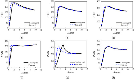 The development trend of the P-S curves of the loading end and the free end of the specimen are basically similar, but at the beginning of loading, the slip of the loading end is more rapid, and the slip of the free end is relatively slow. Approaching the end of the test, the slip of the loading end and the free end is basically synchronous. Damage of specimens gradually accumulated in the push-out process, and the specimen developed from no slip to partial slip and then to overall slip.