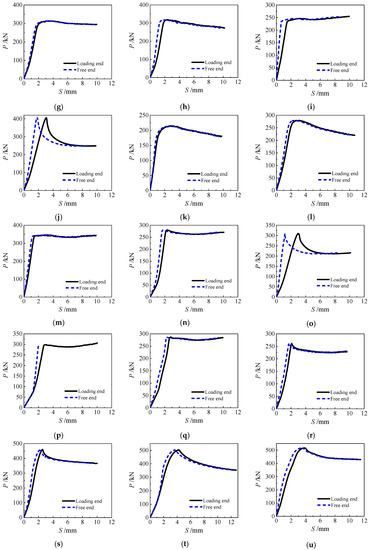Load-slip curves of specimens (a) HSCFST-1W; (b) HSCFST-2W; (c) HSCFST-3W; (d) HSCFST-4W; (e) HSCFST-5W; (f) HSCFST-6W; (g) HSCFST-7W; (h) HSCFST-8W; (i) HSCFST-9W; (j) HSCFST-10W; (k) HSCFST-11W; (l) HSCFST-12W; (m) HSCFST-13W; (n) HSCFST-14W; (o) HSCFST-15W; (p) HSCFST-16W; (q) HSCFST-17W; (r) HSCFST-18W; (s) HSCFST-19W; (t) HSCFST-20W; (u) HSCFST-21W.