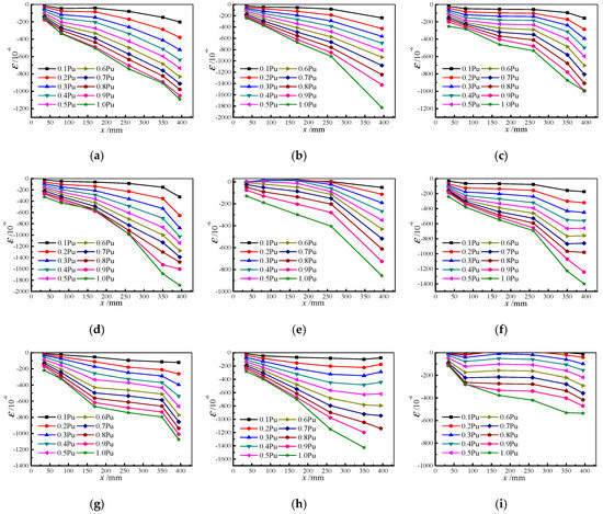 During the push-out test, strain data on longitudinal distribution of specimen along the steel tube can be obtained by attaching the strain gauge to the outer wall of steel tube. Figure 12 presents the strain distribution of some specimens along the longitudinal direction of the steel tube under different load conditions before the load reaches its peak. Where x is the distance from the loading end of the specimen to the arrangement point of the strain gauge.