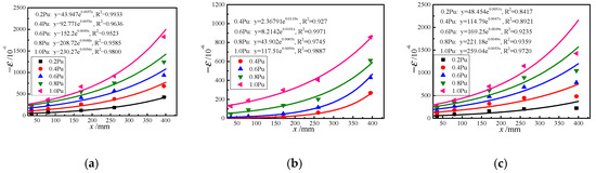 Figure 12 shows that the strain of the outer wall of the steel tube is distributed in an exponential function along the longitudinal direction before the load reaches its peak. It can be fitted by the exponential function constant as ε(x) = aebx. Figure 13 is the fitting results of some specimens, and it can be seen from the figure that the fitting result is good.