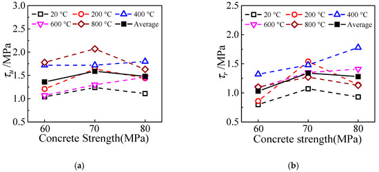 The effect of concrete strength on the ultimate bond strength and residual bond strength can be observed from Figure 16. As can be seen from the figure that with the increase of concrete strength, there is no obvious change in them. This is the same as the conclusion in reference [16] that the interfacial bond strength of HSCFST does not change significantly with the increase of concrete strength, and it is also confirmed that the difference between the material properties of high-strength concrete is weakened by the damage after exposure to ETWC.