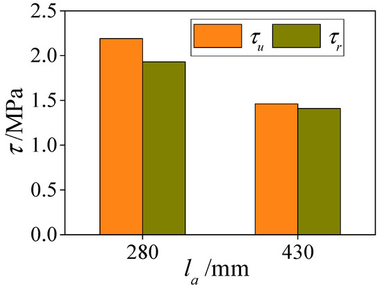 In order to study the influence of anchorage length on the bond strength of the specimens subjected to ETWC, two specimens with anchorage length of 280 mm and 430 mm are set up in this paper under the condition of ensuring the same parameters. The influence of anchorage length on bond strength of specimens is shown in Figure 18. It can be seen from the figure that when the anchorage length of the specimen increases, the ultimate bond strength and the residual bond strength between the interfaces decrease. When la = 280 mm, the ultimate bond strength and the residual bond strength of the specimen are 2.19 MPa and 1.93 MPa, respectively. Compared with la = 280 mm, the ultimate bond strength and the residual bond strength of the specimen la = 430 mm decrease by 33% and 27%, respectively, which is consistent with the effect of anchorage length on bond strength of HSCFST subjected to elevated temperature.