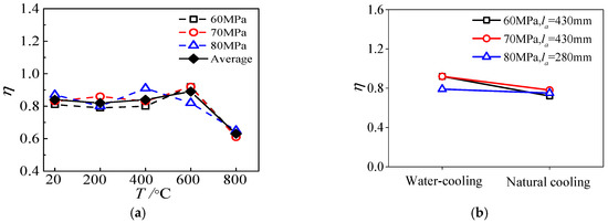 The effect of maximum temperature on ultimate bond strength of specimens subjected to ETWC is presented in Figure 15a. It shows that with increasing temperature, the ultimate bond strength increases first, then decreases, and then increases again. When the maximum temperature is 200 °C, 400 °C, 600 °C, and 800 °C, respectively, the ultimate bond strength is 1.27, 1.55, 1.13, and 1.62 times of that under normal temperature. Thus, it can be seen when the maximum temperature is less than 400 °C, the ultimate bond strength of the specimens increases with temperature rise, but decreases in 600 °C. This is because the interface adhesion between steel tube and concrete mainly includes three parts: chemical adhesion force, mechanical joint force, and frictional force. When the maximum temperature is less than 400 °C, the chemical cementation between them is reduced with the increase of temperature. However, because of the “thermal expansion and cold contraction” effect of different materials, there are differences, especially the concrete materials at elevated temperatures produce irreversible microfracture, which creates deformation in the steel tube that is less than the internal residual deformation of concrete, resulting in the interface to form a pair of compressive force produced by the residual deformation difference after cooling. At a certain temperature range, the strengthening effect of compressive force on the bond strength is greater than the weakening effect of water-cooling on the chemical bond strength. This enhancement effect increases with the rise of temperature, thus making the ultimate bond strength to gradually increase. When the temperature reaches 600 °C, the chemical adhesion force on the interface reduces, and with the loss of concrete strength inside, the mechanical joint force also reduces, and the interfacial bond force is provided mainly by mechanical joint force and frictional force, so the interface ultimate bond strength decreases. However, when the maximum temperature reaches 800 °C, the strength is rebounded. It is different from natural cooling test results; the reasons for this phenomenon is that when the maximum temperature is higher, the rapid drop of temperature will make the deformation of the material increase sharply, which can be proved by the violent crack sound of the internal concrete during the cooling process, which will further increase the compressive force between the interfaces. When the effect of extrusion pressure is greater than that of other factors, it will make the ultimate bond strength of the specimen to rise.