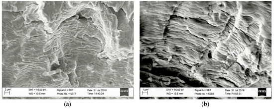Fracture surfaces of the specimens tested at higher loading amplitudes of KIII type (at 45 degrees) were more suitable for fractographic studies. The higher height of the ridges on the fracture surfaces connecting with their reorientation under the influence of the KIII type loading component enables for the preservation of a higher number of fracture areas, with typical fatigue relief observed against the background of artefacts formed during contact of the mating surfaces in each loading cycle. At both loading amplitudes under the KIII type, the typical fatigue features were observed on the fracture surfaces. In particular, among such features were the festoons elongated in the macro direction of crack growth. Within each of them, the same direction of local crack growth was observed, and fatigue striations oriented across them covered their surfaces (Figure 15). The influence of the load, according to KIII type, was manifested in the following. At the loading of specimens according to KI type, the flat festoons delimiting the areas with locally unidirectional crack growth are usually observed [27]. However, under the influence of KIII type, loading the surfaces of each from the festoons revealed the fracture surfaces of specimens were curved. This was especially noticeable in the transitions between adjacent festoons. Obviously, during the testing of specimens according to the KI–KIII type, the festoons were not merged by cleavage way (as it takes place after testing at the KI type loading), but due to the plastic stretching of the bridges between adjacent festoons with the formation of curvilinear ridges between them. The role of the loading amplitude according to scheme KIII is almost levelled at the stage of accelerated crack growth with the expected increase of the spaces between fatigue striations.