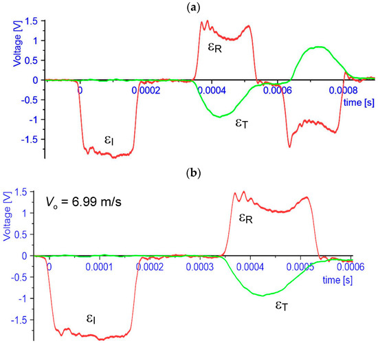 The diameters of all bars were 20.5 mm, the Young’s modulus was 210 GPa, and the density was 7800 kg/m3. The projectile length was 0.4 m; the length of both input and output bars was 1.5 m.