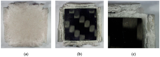 Sample 1_1 after static compression test: (a) the TBC ceramic mat, (b) the substrate PMC layer, and (c) details of damage stage after 2 mm displacement.