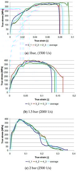 True stress–true strain graphs for three loads in dynamic compression tests at ambient temperature. (a) 21 °C—samples 2_1 to 2_3 (b) 21 °C—samples 3_1 to 3_3 (c) 21 °C—samples 4_1 to 4_3.