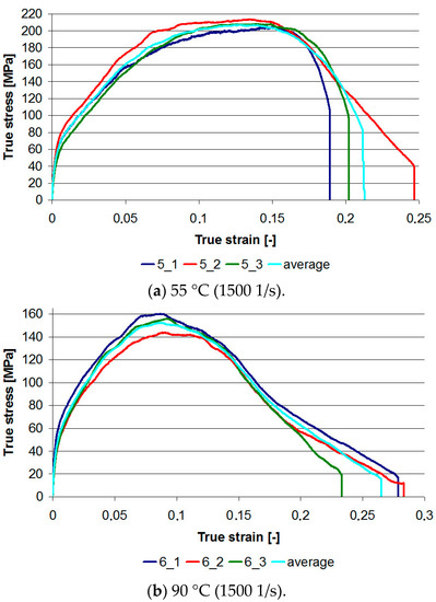 True stress–true strain graphs in dynamic compression tests for two temperatures: (a) 55 °C—samples 5_1 to 5_3; (b) 90 °C—samples 6_1 to 6_3.