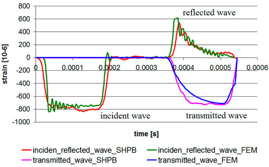 Numerical studies were carried out in the Abaqus/Explicite program. General contact was used with a friction coefficient of 0.1. The first step was to compare numerical and laboratory results of the incident, reflected, and transmitted waves (Figure 15). In general, a good agreement between the measured results and finite element results was observed.