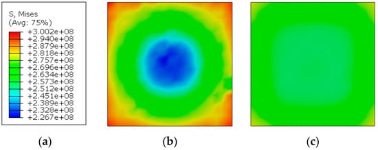 Figure 16 presents Huber–von Mises–Hencky (H–M–H) reduced stress distributions for the TBC layer. From the “input bar” side (Figure 16b), the values are irregular: the maximum value is 300.2 MPa and the minimum value is 267.7 MPa. This type of stress distribution indicates that the corners of the sample will be damaged initially, and the middle part, which is the least efforted, will be the last to be damaged. This type of phenomenon is caused by: the shape of the sample, the occurrence of friction, and the different state of deformation of the material. The material closer to the edge of the sample may deform more freely. This can be seen on the sample after static compression (Figure 5), where the TBC layer was squeezed out of the substrate. An irregular manner of sample damage, starting from its outer edges, was also observed in experimental tests for 1.5 bar and 2 bar pressure.