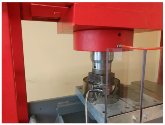 A mixture of iron powder (99% pure Fe, granulation 100–150 μm) and polyvinyl chloride PVC-S (granulation 15–100 μm) was prepared in order to develop some SMC cores for tests. Comparable grain size of both constituents allowed us to obtain a highly homogenous mixture. Polyvinyl chloride used as the matrix material has good mechanical properties. Moreover, it is resistant to many solvents and it is a good electrical insulator. From the obtained mixtures cylinder-shaped samples were formed using a hydraulic press with a mold and a heating band for controlling the heat treatment conditions. Figure 1 depicts the press device used during sample preparation. The powder mixture was backfilled into the mold and subsequently pressed for five minutes at a temperature of 175 °C. This step was aimed at making the mixture plasticized. The difference between the developed samples relied on the application of different force/pressure during their forming. Five samples were developed, for them the range of the applied stamp forces/pressures was from 10 T (78 MPa) up to 65 T (507 MPa). Figure 2 presents some of the developed cores. The core dimensions were: the outer radius—25 mm, the inner radius—15 mm, whereas the height was equal to 10 mm. Some samples were found to be brittle, therefore we focused in subsequent studies on those formed at pressures >310 MPa. Next the measurements of magnetic properties were carried out. The primary (100 coils) and the secondary (30 coils) windings were wound on the examined SMC cores.