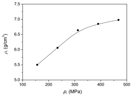 In the next step we determined experimentally how the density of the developed SMC cores depended on the compaction pressure. The appropriate dependence is depicted in Figure 4. It can be stated that as the compaction pressure increased, the material density also increased, which implied better magnetic properties due to a higher packing ratio. The results are consistent with those obtained in Reference [55] for commercial Somaloy. A qualitatively similar dependence (exhibiting saturation after a certain threshold value) was presented in Reference [56]. In the subsequent analysis we focused on the range of compaction pressures MPa, which implied improved magnetic properties.