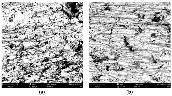 Figure 5 depicts the images of cross-section microstructures for the examined samples from the scanning electron microscope Phenom ProX (ThermoFisher Scientific, Waltham, MA, USA): subfigure a) for compaction pressure 310 MPa (pressure load 40 tons), b) for compaction pressure 470 MPa (pressure load 60 tons). The white areas are iron grains, the gray ones are polymer matrix, whereas the darkest spots are air gaps. From the figure it is visible that the increase of compaction pressure resulted in decreased volume of air gaps in the SMC material. Moreover, it can be noticed from the figure that iron grains were subject to flattening and formed layers under compaction pressure. For comparison, in Figure 6 the microstructure of the surface for the sample subject to compaction pressure 390 MPa (pressure load 50 tons).