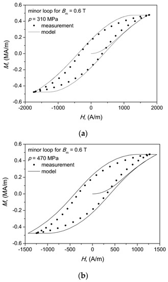 Modeled hysteresis curves for Bm = 0.6 T: case (a)—for 310 MPa, case (b)—for 470 MPa. Dots denote measurement points.