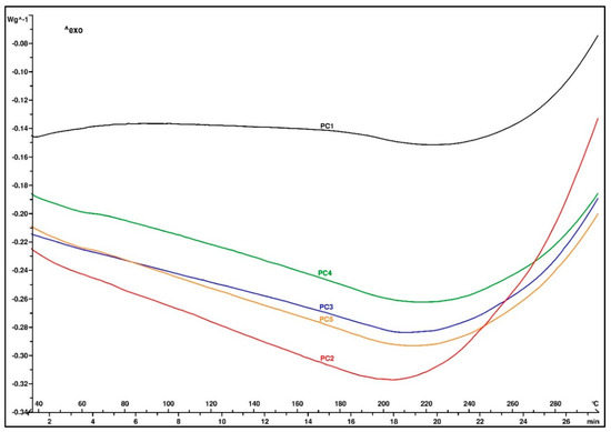 A thermogram of the samples after the post-curing treatment is shown in Figure 5. No residual exothermic peak of the cross-linking reaction was observed, indicating that the material was completely cured. The thermal decomposition started above 200 °C and showed the good thermal stability of all five EMCs.