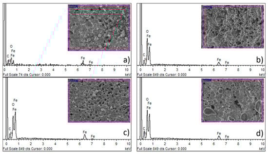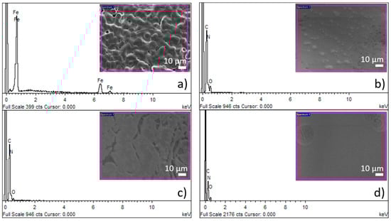 Chemical composition of the surface of (a) pure Fe; (b) Fe-PEI1; (c) Fe-PEI2; and (d) Fe-PEI3 samples studied by the energy dispersive X-ray analysis (EDX) method.