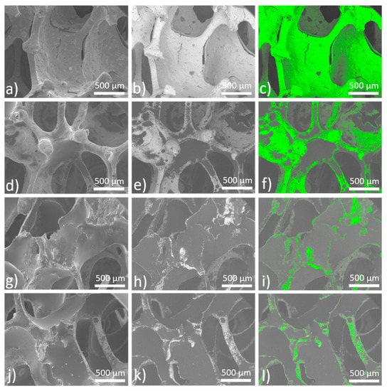 Sintered iron foams were ultrasonically cleaned and dip-coated with three different concentrations of PEI. The thin polymeric coating was observed after solvent evaporation. Ethanol (96 vol %) was selected as a solvent to achieve fast evaporation and to minimize the risk of material corrosion during the manufacturing processes. The presence of the polymeric layer was confirmed by the EDX method, where nitrogen, carbon, and oxygen were spotted for the coated samples while only iron was detected for the uncoated specimen, as shown in Figure 2. The average (from 10 measurements) weight of the resultant coating for different PEI concentrations and corresponding weight percentage is summarized in Table 1. While the PEI1 coating forms almost 2.0 wt % of the sample, it is 5.0 wt % for the PEI2 and 6.6 wt % for the PEI3 sample. The small difference between the weight of the PEI2 and PEI3 coating should be attributed to the higher saturation on the sample surface and depletion of the free space available for deposition. Similar space occupation by the polymeric layer for PEI2 and PEI3 can be seen in Figure 3i,l, while the uncoated areas are present when the sample is coated with only PEI1 (5 wt % of PEI) solution.