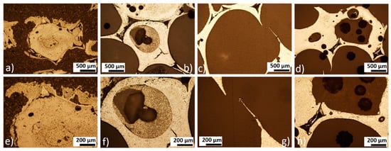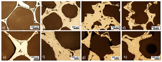 The microstructure of porous iron foams before and after 4, 8, and 12 weeks of corrosion was observed using an optical microscope (Olympus GX71, OLYMPUS Europa Holding GmbH, Hamburg, Germany). Samples were molded into the methyl-methacrylate resin (Dentacryl), hardened, and grinded.