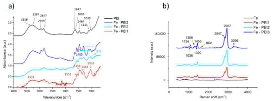 The polymeric layer was confirmed and analyzed by different methods. FT-IR and Raman spectra were recorded before the corrosion of material to study the PEI layer and its interaction with the Fe matrix, as shown in Figure 5.