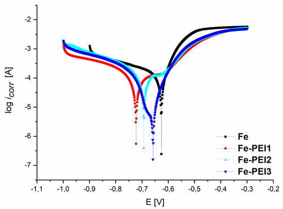 The coating of the iron foams with the PEI has resulted in the shift of the corrosion potential to the more negative values obtained for all three different concentrations of polymer. The lowest value of Ecorr was observed for the Fe-PEI1, followed by the Fe-PEI2, Fe-PEI3, and the pure iron, which exhibited the most positive value (−627.0 mV). Reported corrosion potentials of the pure iron observed by the anodic polarization method were −860.7 mV [], −484.0 mV [] or −510.0 mV []. For example, in [], the authors studied electrochemical degradation of the pure iron bars and phosphated iron bars in Hanks’ solution and observed the corrosion potential of pure iron to be −670 mV, which is similar to that observed in this study. It can be seen, from the different results for the same composition of the sample (Fe), that the corrosion rate is dependent also on the preparation method and sample geometry. The foam-like structure of the samples prepared by the powder metallurgy method resulted in the shift of the electrochemical corrosion potential to more negative values when compared to that of standard pure iron.