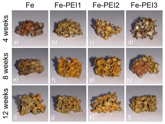Static immersion tests provide complex information about the degradation processes of metallic samples and also about the changes in the corrosion medium. The most important advantage of this type of corrosion testing is its ability to simulate real-body conditions in a more authentic way than dynamic electrochemical tests. Pictures of iron and PEI-coated iron foams after degradation tests are shown in Figure 7. After 8 weeks of corrosion, all samples were completely covered with corrosion products in brown, red, and orange color forming the rust. With the prolonged time of immersion, surface roughness and inhomogeneity increased for all samples, as shown in Figure 8, Figure 9 and Figure 10. Uniform corrosion, as shown in Figure 8a,b, was observed in the initial stage of degradation whereas pitting corrosion, as shown in Figure 9f,g, typical for the environment with high concentration of chloride ions [], occurred with prolonged time of immersion. In Figure 10 are presented cross-sections of the Fe and Fe-PEI samples after 12 weeks of corrosion. The main difference, compared to the un-corroded material shown in Figure 4, could be observed in the thinning of the cell walls accompanied by cracking at the narrowest points, as shown in Figure 10c,d, which can lead to the worsening of the mechanical properties of such material.