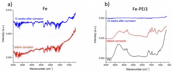 The influence of the corrosion environment on the Fe and Fe-PEI was investigated by FT-IR, as shown in Figure 13a,b, respectively. In Figure 13b, the spectrum of PEI is also included for comparison. The individual intensities of the spectra were adjusted in order to create a comparable figure, namely, the intensities of the polymer and Fe-PEI samples were decreased 10 and 5 times, respectively. The spectra of iron, as shown in Figure 13a, before and after corrosion are almost identical; the differences stay within the measurement error. Neither of the samples exhibit a significant band in FT-IR. The difference between the spectrum of the pure PEI and Fe-PEI specimen was already described earlier. After 12 weeks of corrosion, no bands can be observed, thus the organic layer was completely decomposed. Reactions ongoing during iron degradation in Hanks’ solution were already described [].