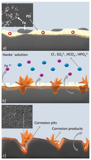 Schematic representation of corrosion processes ongoing on the surface of the Fe-PEI material. (a) Polymer-coated sample on-air; (b) polymer-coated sample after immersion into Hanks’ solution—PEI layer disruption; (c) formation of corrosion pits after 12 weeks of biodegradation.
