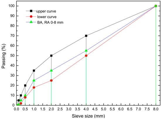 Natural rinsed quartz sand (0–2 mm), natural basalt aggregate (BA) (2–8 mm), recycled aggregate (2–8 mm), and silica fume (SF) were utilized for concrete preparation. The grain size of BA and RA is shown in Figure 1.