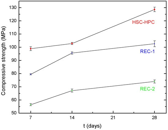 As shown by Fonseca et al. [9], the compression strength of all NAC and RAC analyzed by them increased with age. The average compression strength (fcm) after 7, 28, and 56 days was 42.8, 49.8, and 51.6 MPa, respectively. In general, after 7 and 28 days of curing, the samples showed about 80% and 95% of their 56-day compression strength [9], respectively. In our study, it was found that, for all concrete types, including HSC-HPC and REC-1 and REC-2, the 28-day strength was 23, 22, and 24% higher than the 7-day strength (see Table 9, Figure 3).