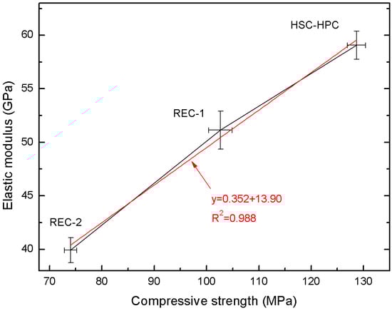 Figure 4 presents the changes in the elastic modulus E of concrete depending on the amount of recycled aggregate and concrete compression strength after 28 days. The linear trend was characterized by a R2 = 0.988 and relatively low errors in the intercept. The obtained correlations can be described by the equation: y = 0.325x + 13.90.