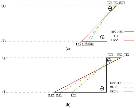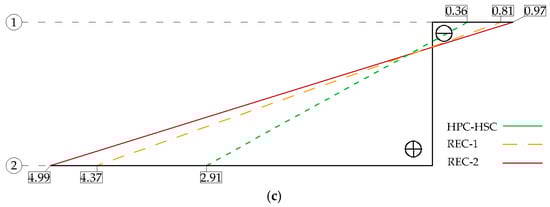 On the basis of the test results shown in Figure 8, it can be stated that the deflection values for the recycled aggregate beams were higher than these for the natural aggregate beams in the case of homogeneous HPC-HSC beams for the given level of the loading force; however, the deflection values were lower in comparison to those for the homogeneous beams made of normal concrete. On average, the deflection values for the recycled aggregate beams were 20% higher than in the case of the control beams made of HPC-HSC alone. It was also noticed that the differences between the deflections observed for the recycled aggregate beams and the natural aggregate beams were significantly greater for the lower loading levels. When the deflection is less than 3 mm, one-way ANOVA analysis of variance at a significance level of 0.05 showed that all means of the deflections results differ statistically significantly between HSC-HPC and REC-1 and HSC-HPC and REC-2, because p takes values < 0.05 (0.023, 0.038 respectively). The ANOVA test showed no significant differences in the deflection values between REC-1 and REC-2 (p = 0.765).