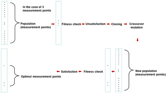 Given the limited number of sensors that can be used, the selection of an optimum measuring position allows for more accurate deformation predictions. In the study, the location of the strain sensor is determined via a genetic algorithm. The genetic algorithm is an imitation method of the law of survival of the fittest and crossing over [22]. In the implementation of the genetic algorithm for optimization, the population size, the number of subpopulations and the maximum number of generations for evolution must be chosen [23]. Figure 3 presents the flow chart of the genetic algorithm. The population is selected to ensure an optimal solution. A new population is created via the cloning and mating of this population. After determining the solution wherein the conditions are satisfied, this sequence is repeated until the optimal solution is determined. In this study, the optimal solution is obtained via minimizing condition number (CN) [24]. CN is the relationship between the minimum value and the maximum value in the matrix. In the case of the DST matrix, it was determined that the smaller the CN value showed a higher accuracy of the prediction.