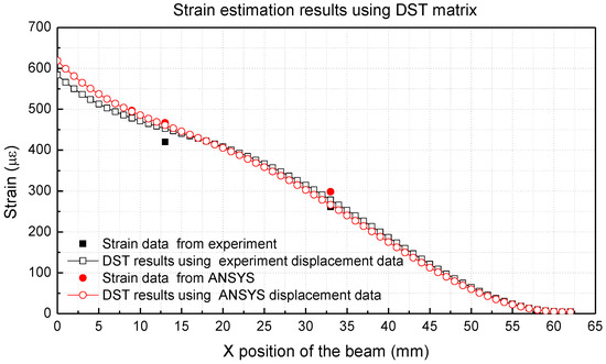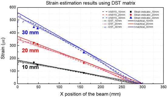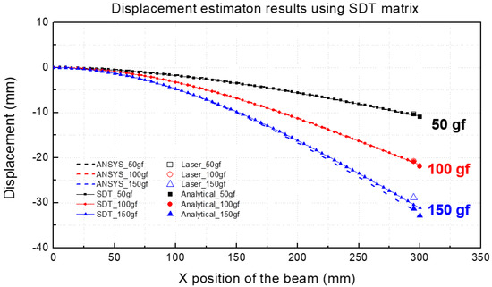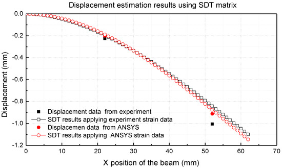 Figure 6 shows the results obtained by applying the measured strain values to the SDT matrix and comparing the displacements that were calculated by using the predicted displacement and beam deflection equations and the displacement values obtained by the analytical method employing ANSYS.