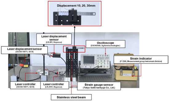 The locations of the displacement sensors were selected as corresponding to 96, 196 and 287 mm from the genetic algorithm. Two laser displacement sensors measured the structural deformation at 96 mm and 196 mm. The deformation at 287 mm is measured using a ruler, as shown in Figure 7. At the 287 mm point of the beam, the structure was deformed by pulling the beam by 10, 20, and 30 mm. With respect to the 96 mm and 196 mm locations, as shown in Figure 8 and the displacement of each point was obtained via laser displacement sensors. The strain of the stainless steel beam was measured with a strain indicator, and the measurement position was identical to the position of the strain gage sensor in the SDT experiment.
