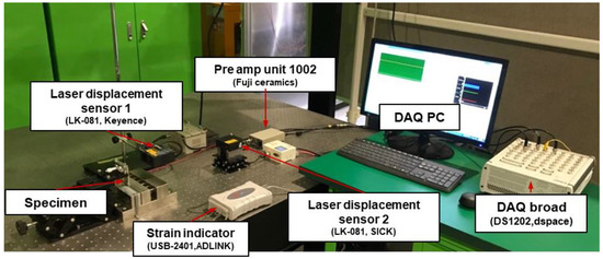 Figure 11 shows the complete experimental setup for the deformation and strain estimation of the multilayer structure. An end of the specimen was fixed and the other end was deformed in the out-of-plane direction via the linear stage until the specimen was broken. Displacement and strain of the multilayer structure were measured via laser displacement sensors and strain gages, respectively.